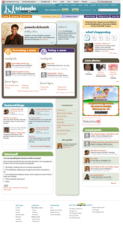 Internet-savvy women who influence household buying decisions make up this online community's growing, interactive membership. TriangleMom2Mom has become the leading source of information for mothers in the Triangle, whether they are trying to conceive, pregnant, a new mom or coping with kids.