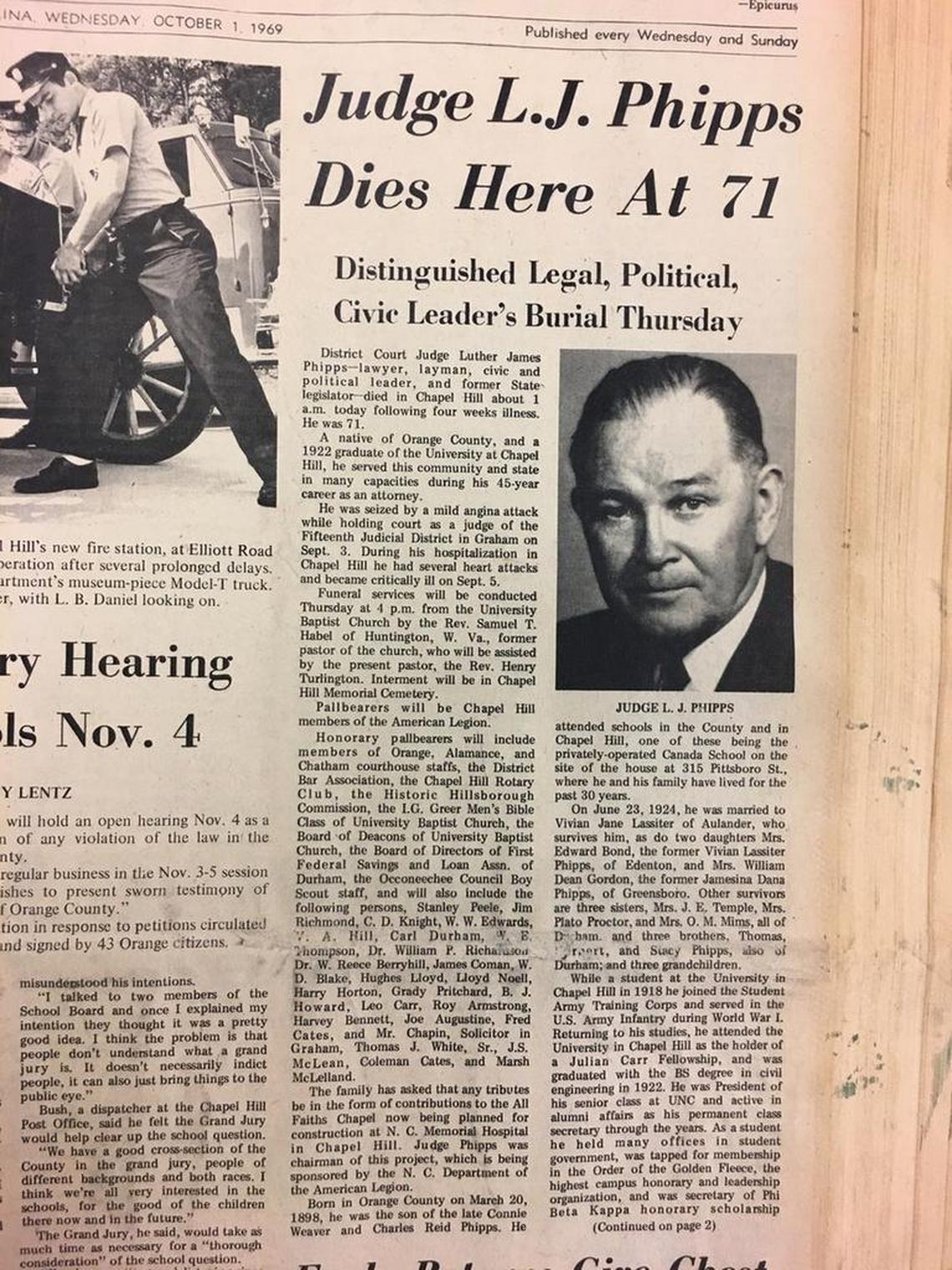 When Phipps died in 1969 as a sitting district court judge after nearly 30 years on various benches, a lengthy front-page obituary in The Chapel Hill Weekly lauded a powerful man integral to the decision-making of just about every organization around. Seemingly half of the town’s adult males were honorary pallbearers.