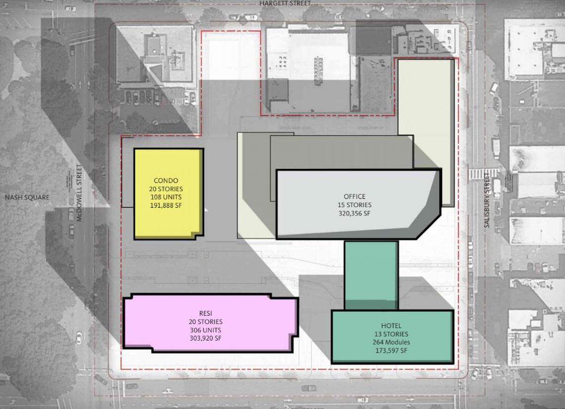 Acquisition Group, the California investment firm that bought the 3.3-acre property on South McDowell Street in 2017 for $22 million, plans to turn it into a mixed-use complex, and the first phase will be a 20-story tower that will face Salisbury Street, according to a statement from the company on Thursday. Fifteen floors of the building will be for office and five stories will be for parking, a spokesman for the developers said on Friday.