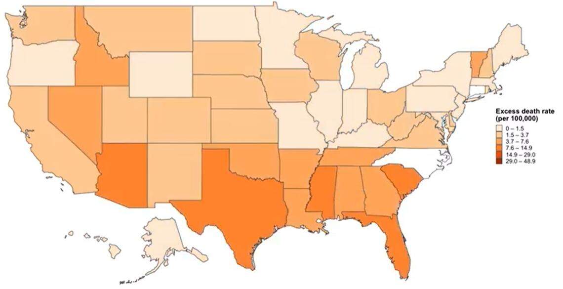 The top 10 states with the highest per capita rate of excess deaths were New York, New Jersey, Massachusetts, Louisiana, Arizona, Mississippi, Maryland, Delaware, Rhode Island and Michigan.