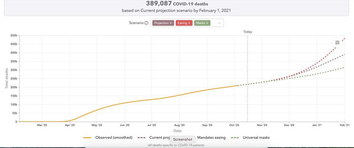 But the model warns deaths could increase if preventive mandates ease across the country — with at least 482,931 deaths by Feb. 1. Meanwhile, if all Americans wear masks, then the country could save about 168,000 people from dying when compared to the worst case scenario.