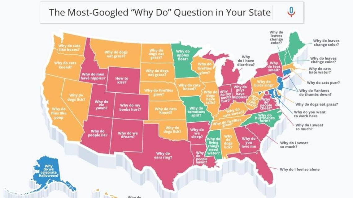 The survey used autocomplete data when searching the term “why do” to create a list of the top 100 questions asked and analyzed each question in Google Trends to see what each state asks the most.