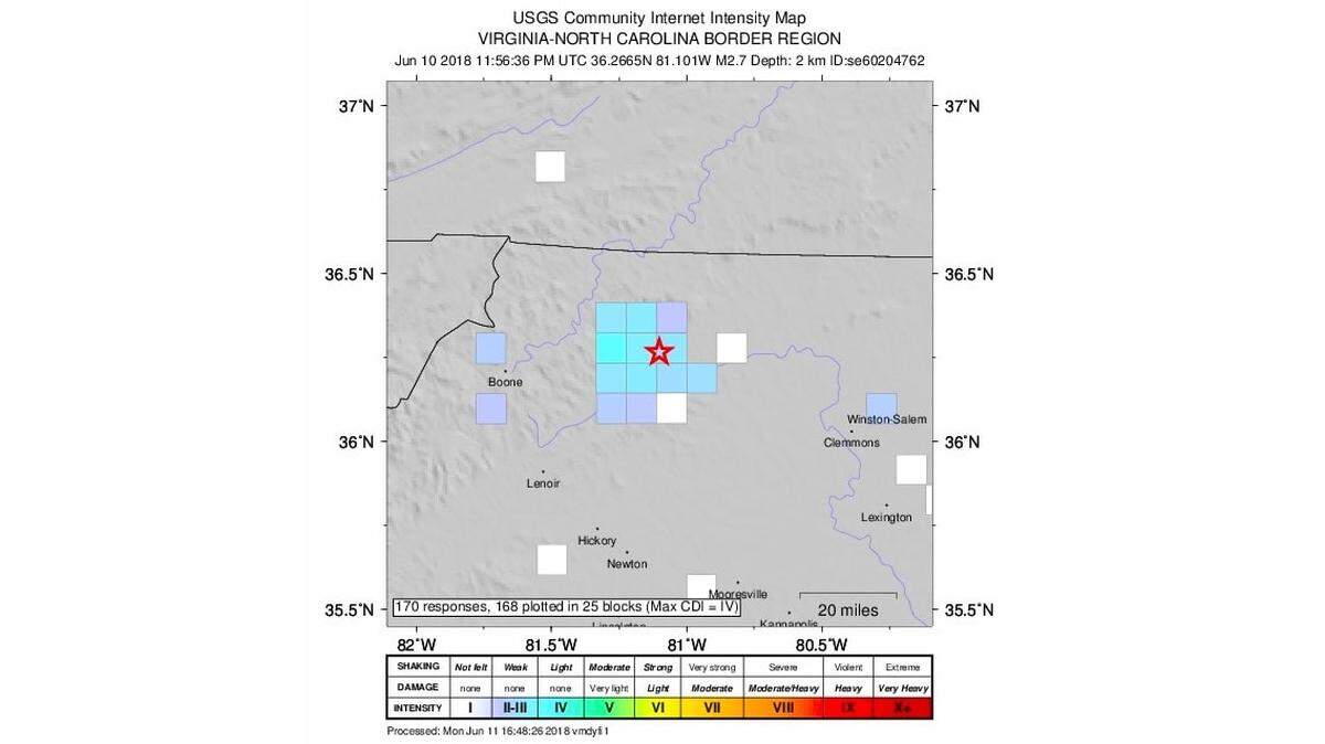 No damage was reported, but the USGS said that some people may have felt the first quake as a light shaking and weak shaking spread as far as Winston Salem and Boone.