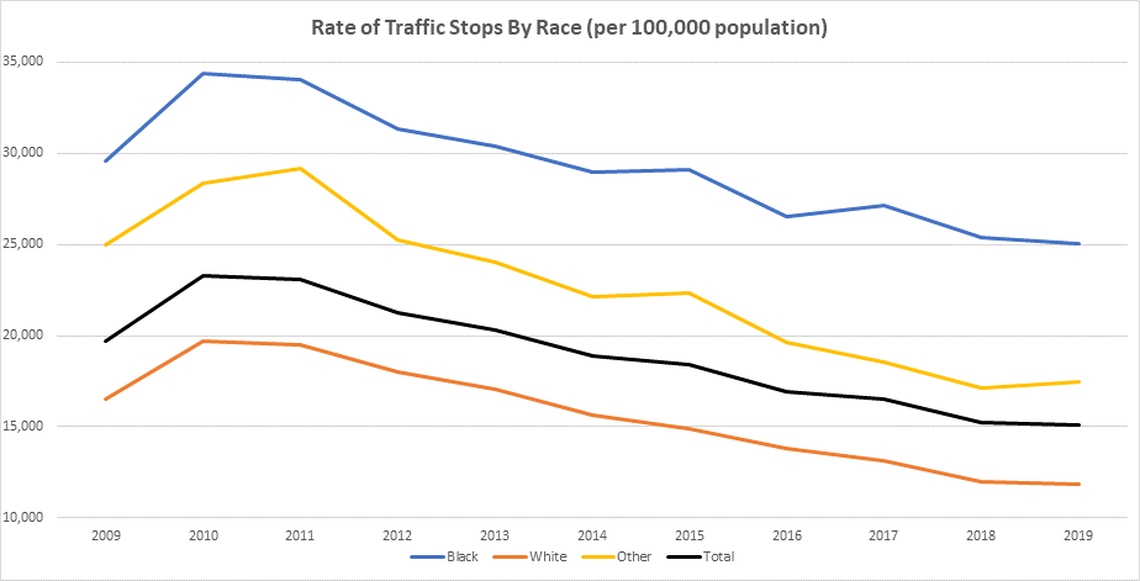 Traffic stops dropped since 2008, but Black drivers were still stopped at a much higher rate than white or Hispanic drivers.