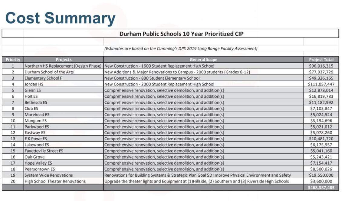 A 2019 assessment found Durham Public Schools needs $727 million for maintenance and improvement projects like new schools over the next 10 years.