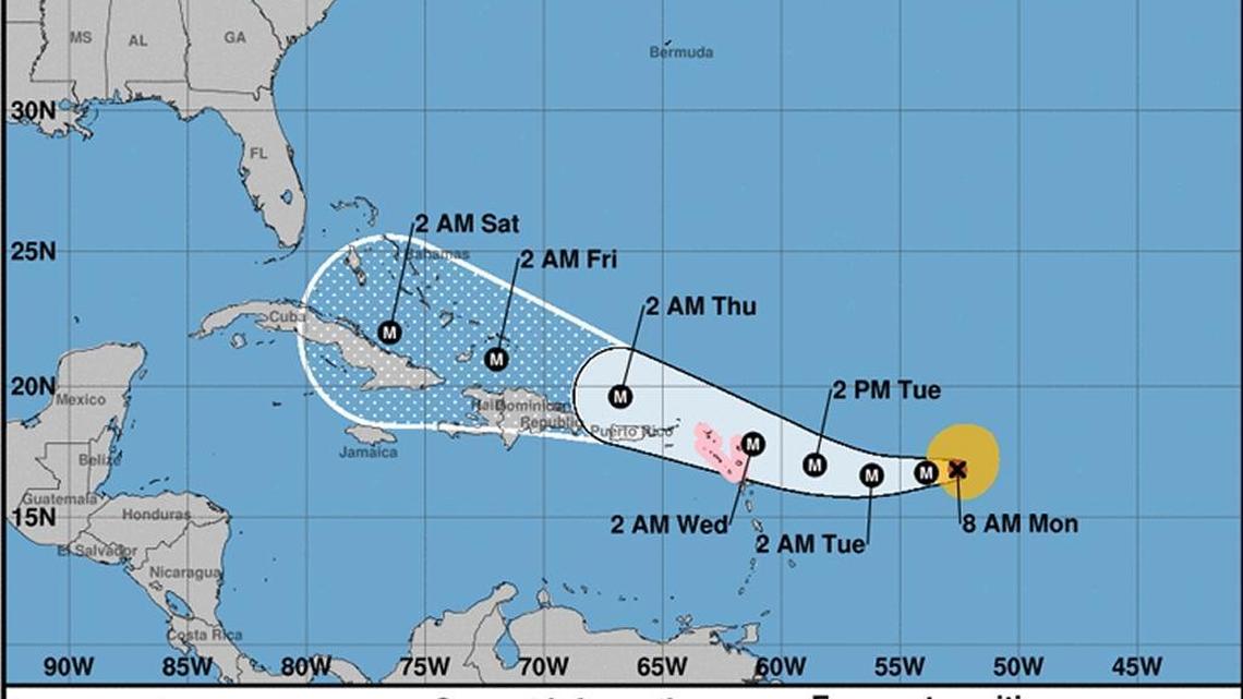 The National Hurricane Center said the U.S. Virgin Islands, Puerto Rico, Dominican Republic, Haiti and Leeward Islands should monitor the progress of Irma, which is expected to turn west later Monday then kick up west-northwest Tuesday. Whether or not it’ll strike the U.S. East Coast can’t be definitively predicted, but most projections have it at least affecting the East Coast weather.