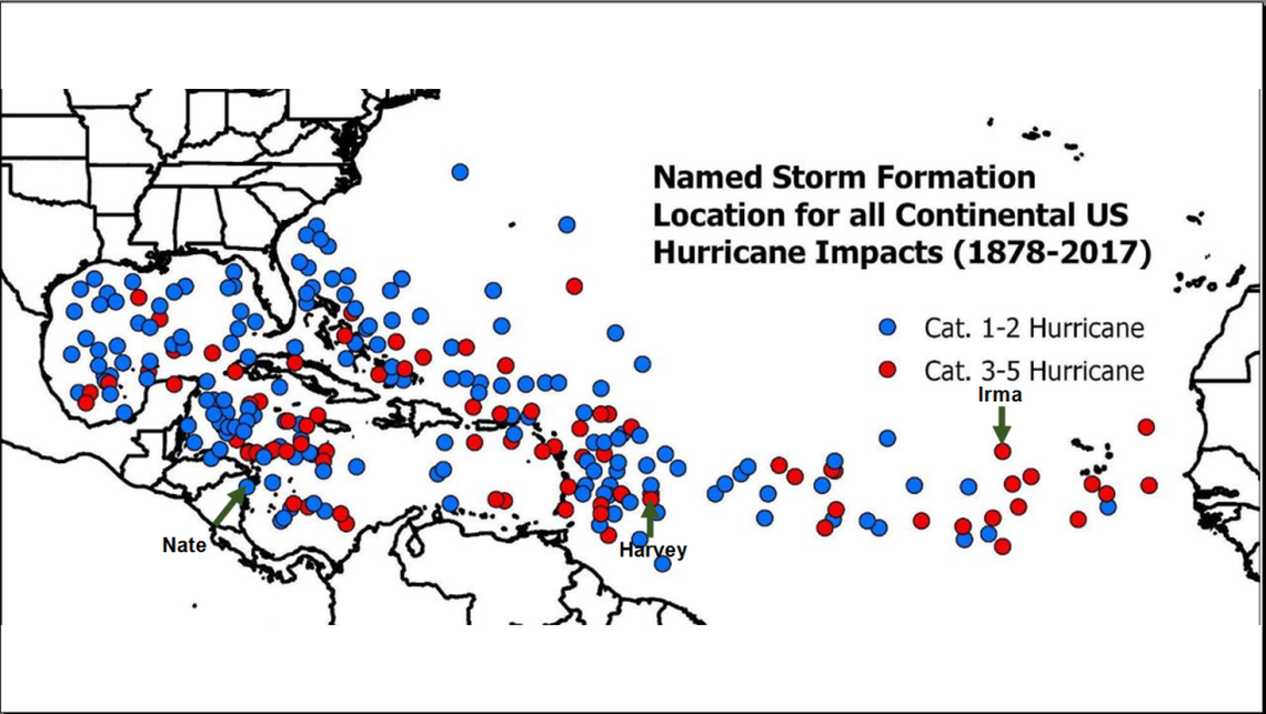 To create the forecast, Klotzbach and Bell looked at past years with similar ocean and atmospheric conditions, including weak La Niña and El Niño patterns. Because ocean temperatures that can fuel hurricanes remain uncertain over the summer and fall, they looked at wide range of temperatures and came up with five comparable seasons. One of those, 1967, included lethal Hurricane Donna, a Cat 4 storm that killed more than 125 people as it wound through the Caribbean, including 13 in the Keys.