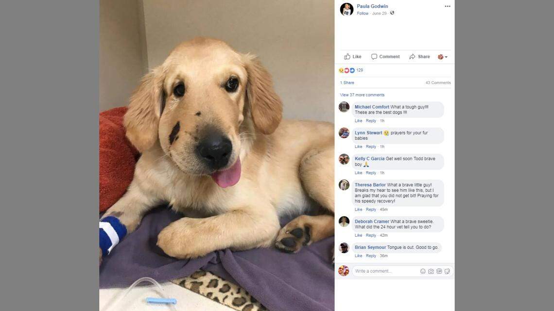 The post also included a collage of photos of Todd, some of which showed the 6-month-old Golden Retriever wearing the effects of a venomous bite. The right side of his muzzle was swollen out of proportion and bore marks of discoloration, which patch.com reported was dried blood from where the rattlesnake struck.