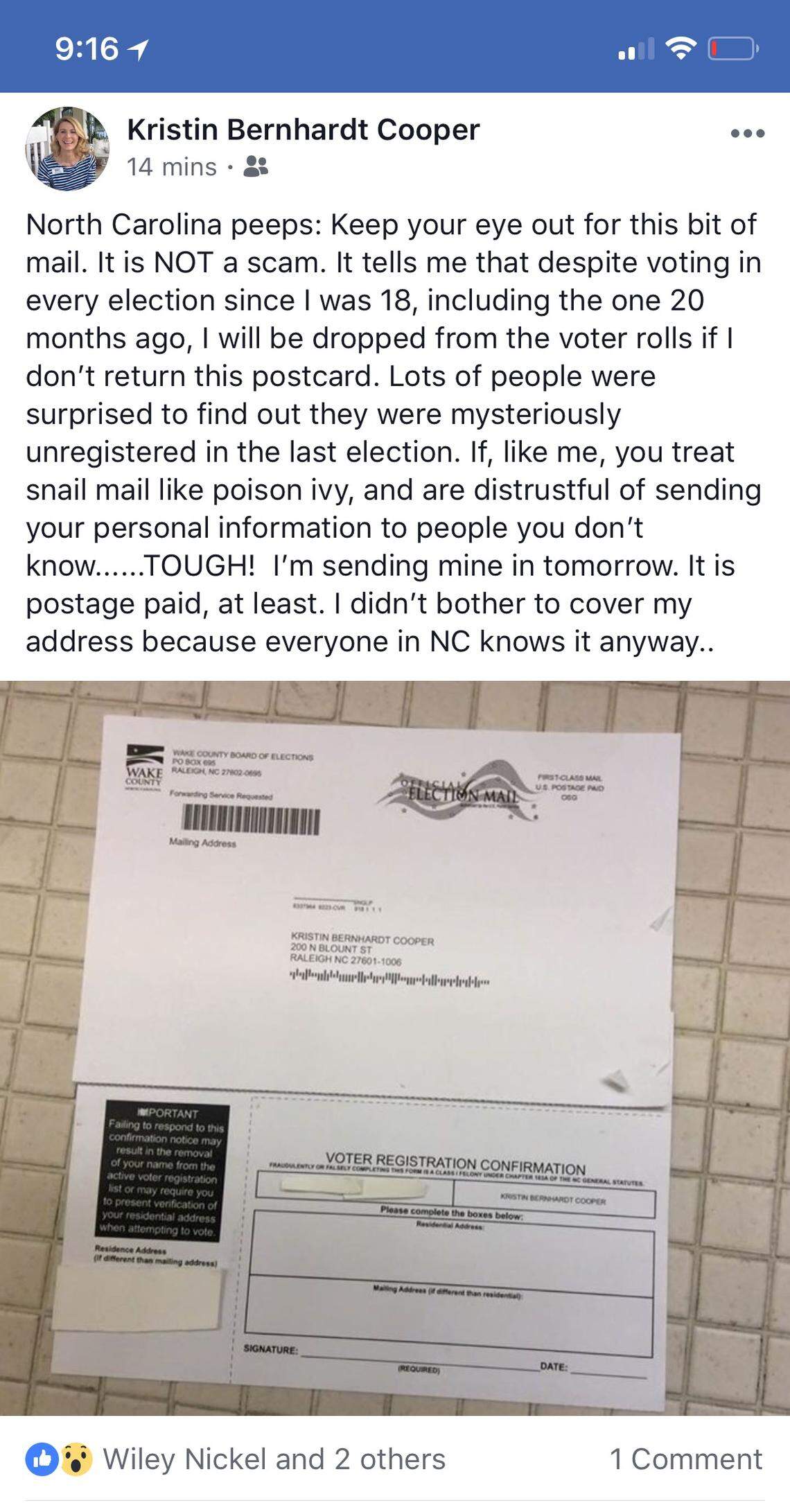 "It tells me that despite voting in every election since I was 18, including the one 20 months ago, I will be dropped from the voter rolls if I don't return this postcard," she wrote on Facebook.