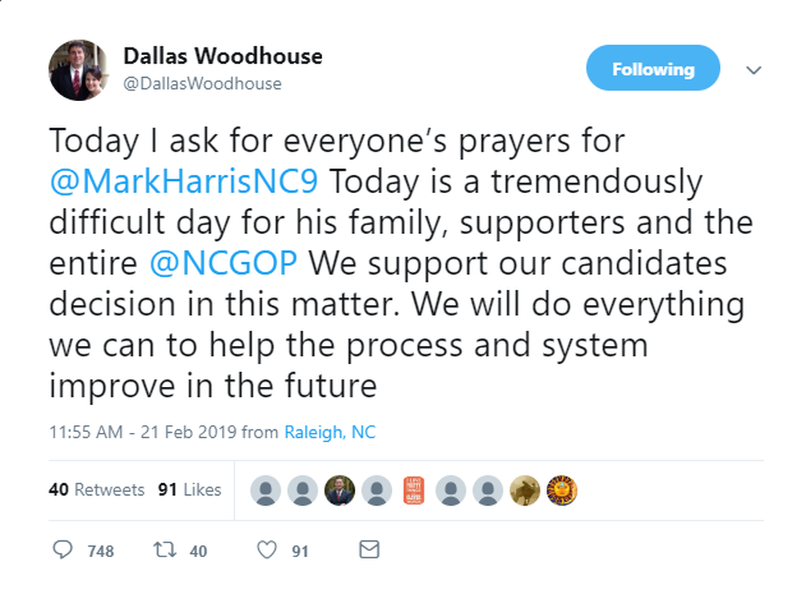 “Today I ask for everyone’s prayers for @MarkHarrisNC9 Today is a tremendously difficult day for his family, supporters and the entire @NCGOP We support our candidates decision in this matter. We will do everything we can to help the process and system improve in the future,” Woodhouse tweeted on Feb. 21.