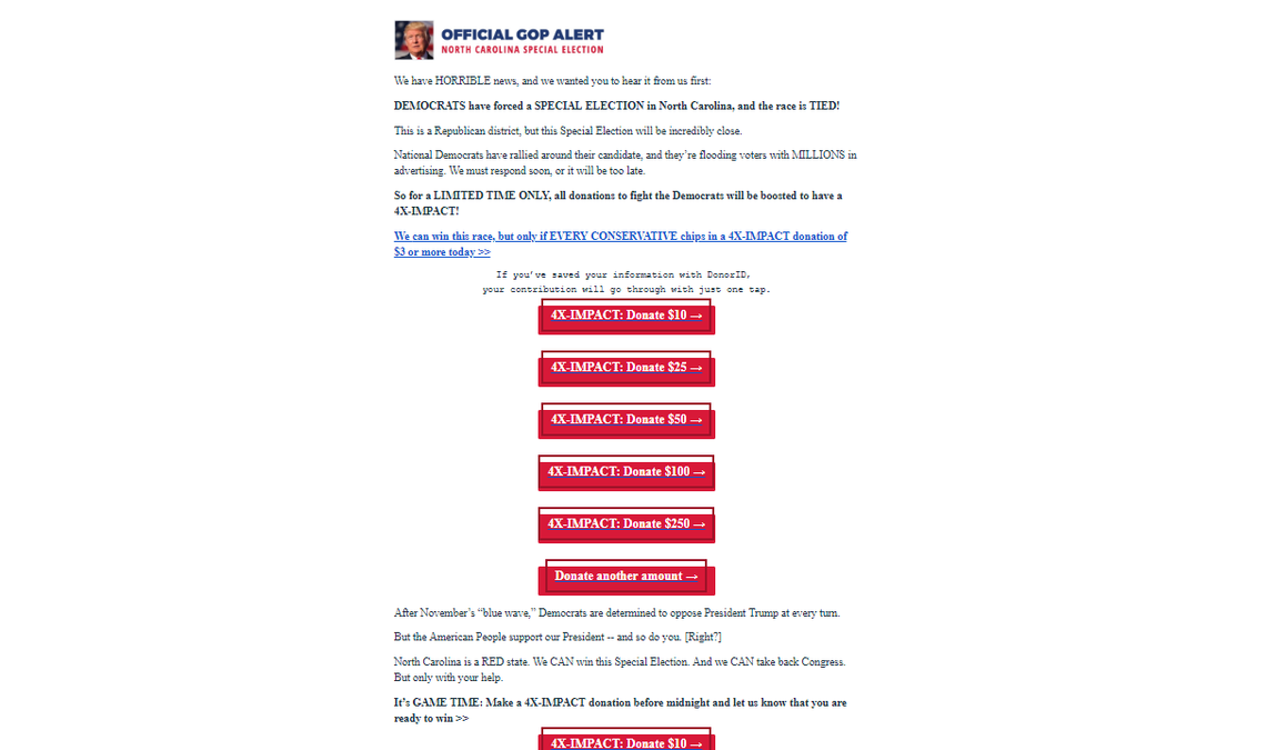 “Democrats have forced a special election in North Carolina, and the race is tied!” the email says in bold print.