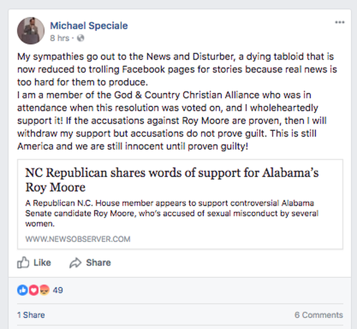 State Rep. Michael Speciale represents an Eastern North Carolina district. His Facebook page on Wednesday reposted a resolution in support of Moore passed by the God and Country Christian Alliance in New Bern, where he lives. The resolution was first published online by Jerry Schill, the group’s leader, and Speciale “liked” the post.