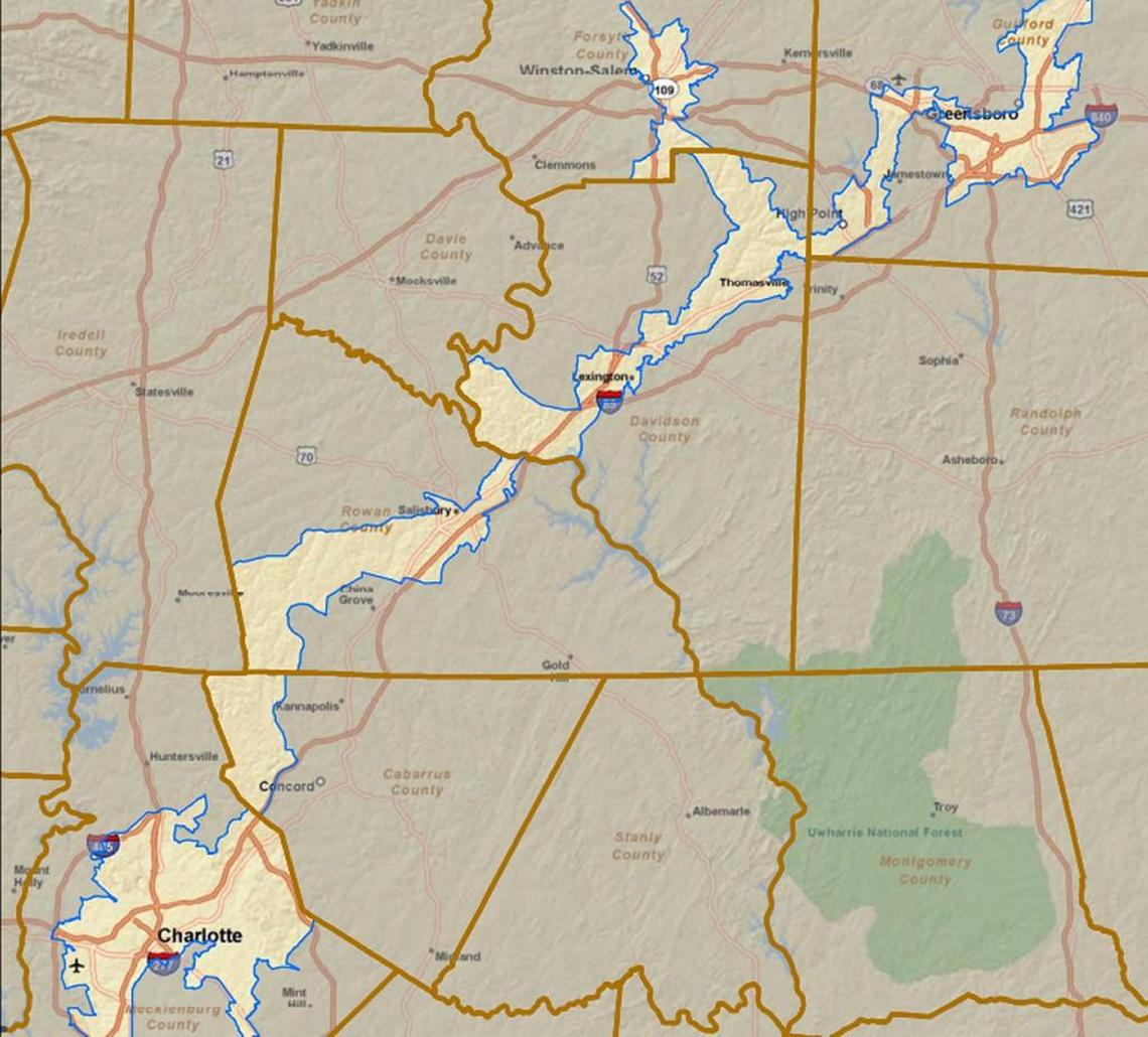 The district, a Democratic stronghold currently represented by Democrat Alma Adams, is now entirely within Mecklenburg County, but before court-ordered changes in 2016, Republicans and Democrats before them had drawn the district as a strip along the I-85 corridor.