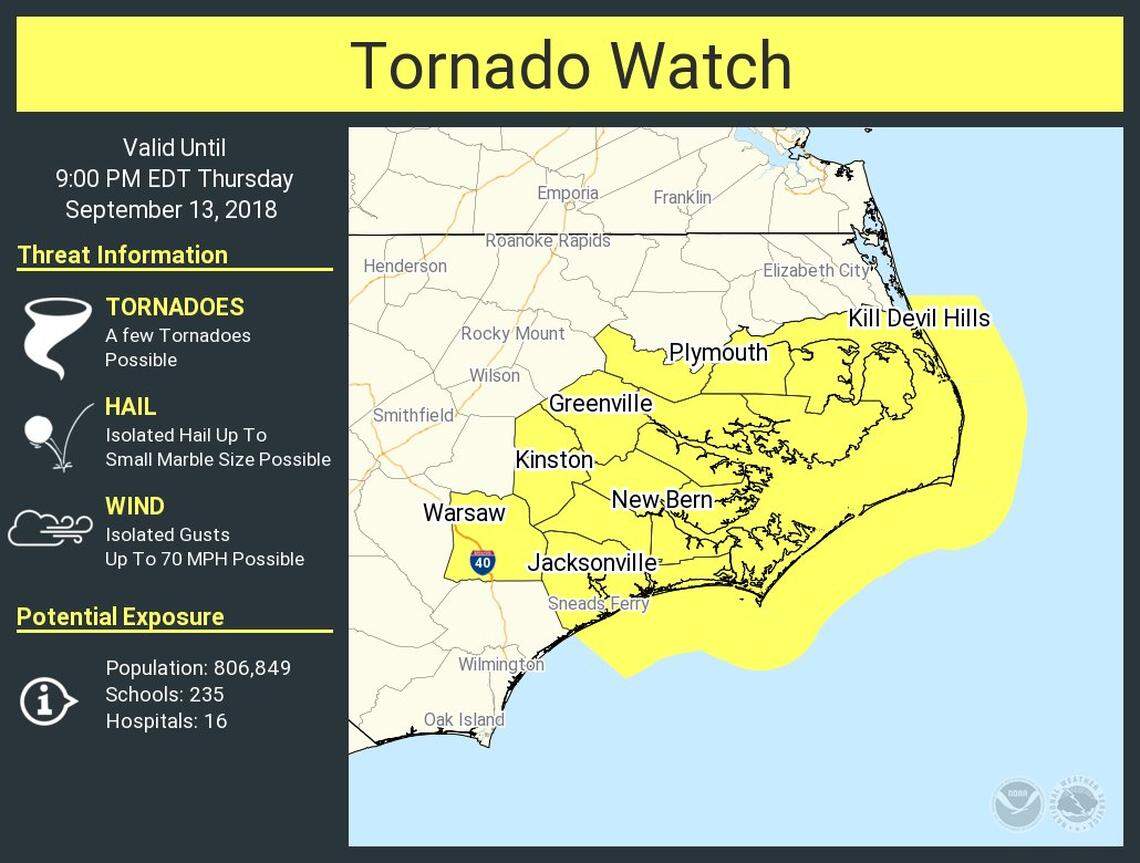 Hurricane Florence’s heavy winds and rain have prompted a first round of tornado watches along coastal North Carolina. The watch is in effect until 9 p.m. Thursday.