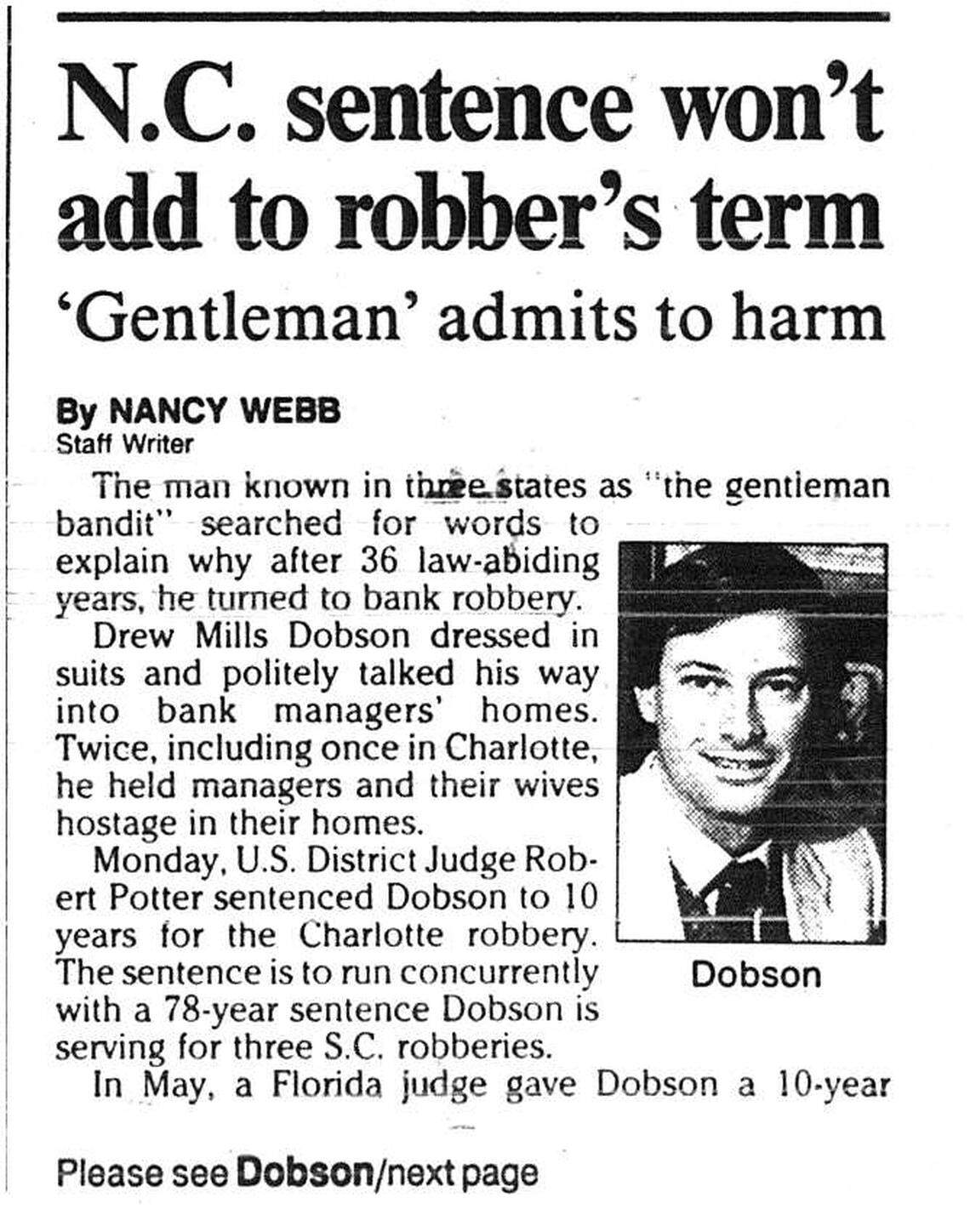 Dobson was locked up for robbing five banks in South Carolina, North Carolina and Florida over a 10-month period, bagging $485,000. He carried a sawed-off shotgun, but was called the “Gentleman Bandit” because he wore three-piece suits and sometimes treated bank employees politely.