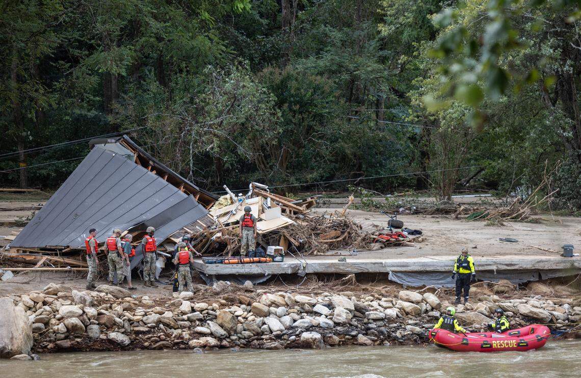 The town of Lake Lure said firefighters and town workers went door to door rescuing people in the most affected area, many on foot or via helicopter because of closed roads. The top of the lake was covered in debris, including floating propane tanks, that the Broad River swept up on its way through Chimney Rock.