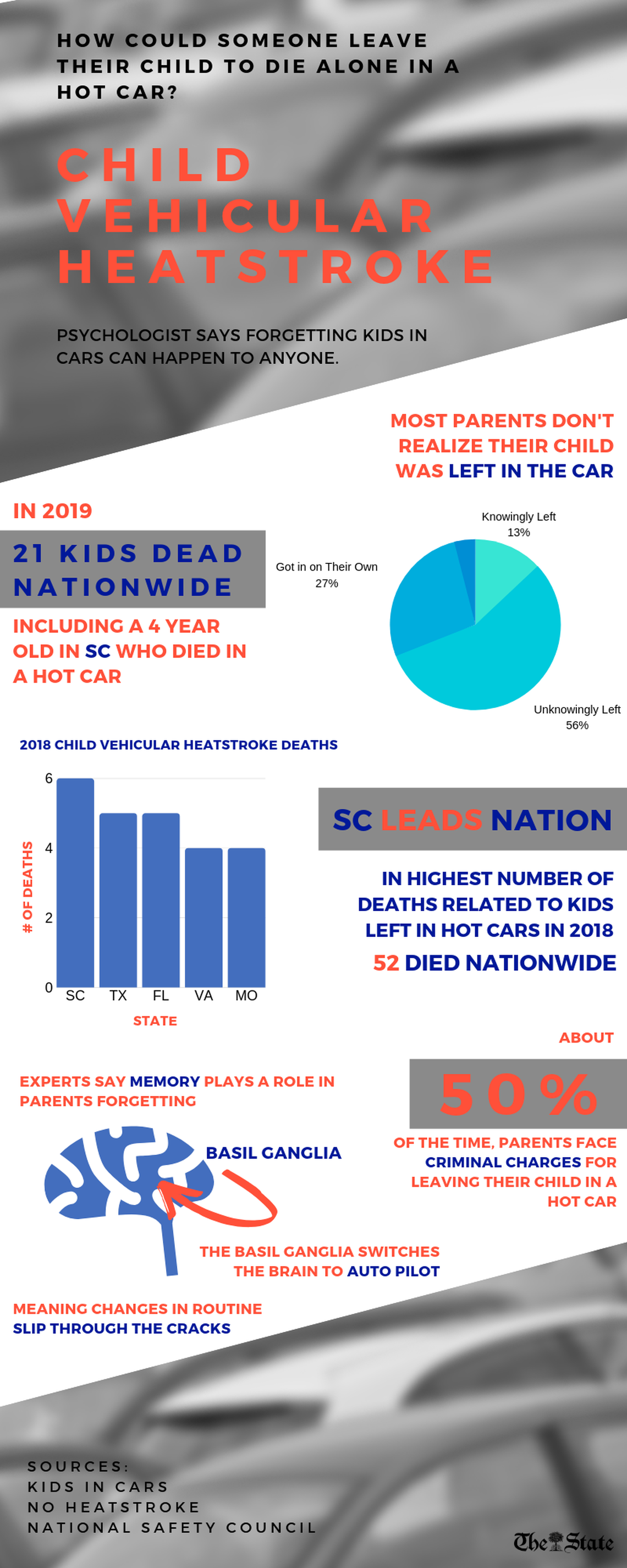 This story was originally published July 18, 2019 at 5:00 AM with the headline "SC led the nation for kids dying in hot cars. It could happen to any parent, expert warns."